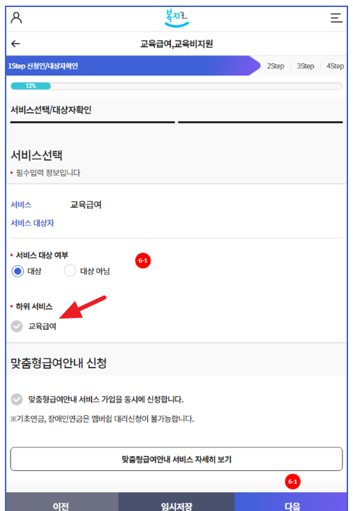 6-1. 서비스를 신청하기 위해 서비스 대상 여부에 체크하고 하위서비스인 '교육급여'에도 체크하고 '다음'을 누릅니다.