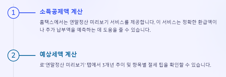 이 서비스는 정확한 환급액이나 추가 납부액을 예측하는 데 도움을 줄 수 있으며, 절세 전략을 세우는 데 유용합니다.