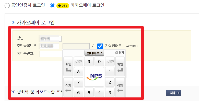 성명, 주민등록번호, 휴대폰번호를 입력합니다. 주민번호의 뒷자리는 마우스로 입력합니다.