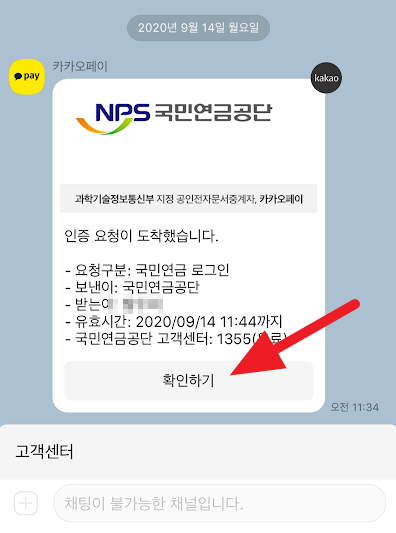 그러면 다음과 같은 화면이 나오면서 이제 휴대폰에 온 카카오톡을 보고 "확인하기"를 누릅니다.
