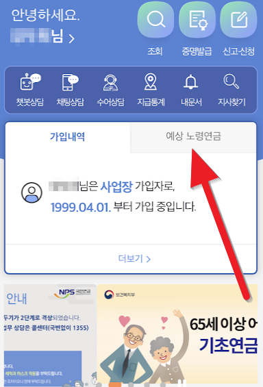 여기에서 아래처럼 "예상 노령연금"을 누릅니다.