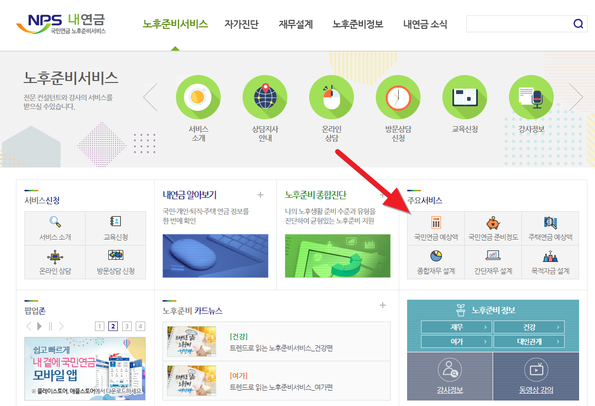 우선 제가 아래 연결할 수 있도록 해놓은 NPS내연금(국민연금 노후준비서비스)로 들어가서 "국민연금 예상액"을 클릭합니다.
