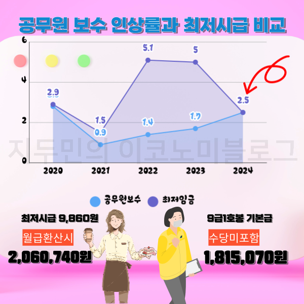 2024년 대한민국 공무원의 급여는 2023년의 물가변동률인 3.3%보다는 적지만 다행히 동결되지 않고 2.5% 인상되었습니다. 이 글에서는 2024년도 공무원 급여를 알아보고 최저시급과 비교를 해보겠습니다.