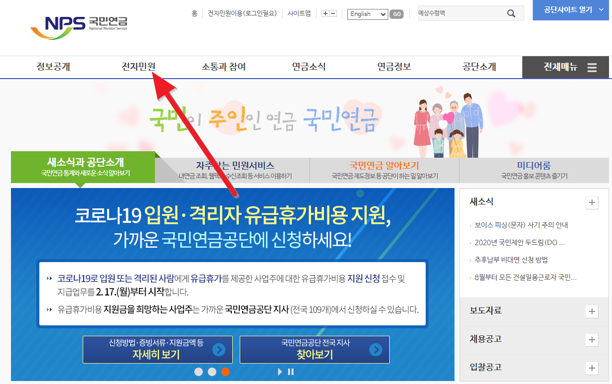 아래링크를 걸어놓은 국민연금공단 홈페이지로 가셔서 아래처럼 "전자민원"으로 마우스를 가지고 갑니다.