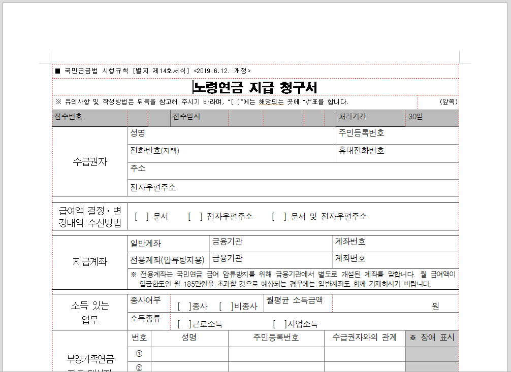 조기노령연금청구서 양식은 노령연급지급청구서 서식과 동일한 서식을 사용합니다.