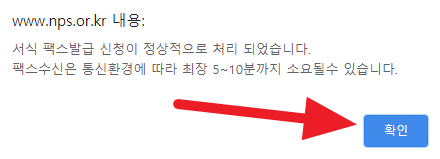 그러면 바로 "서식 팩스발급 신청이 정상적으로 처리되었습니다. 팩스수신은 통신환경에 따라 최장 5~10분까지 소요될 수 있습니다. 라고 나옵니다. "확인"을 누릅니다.