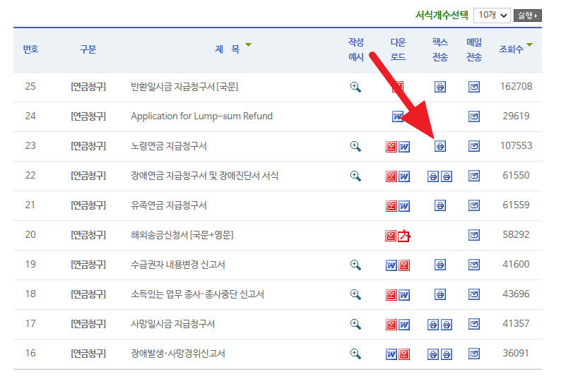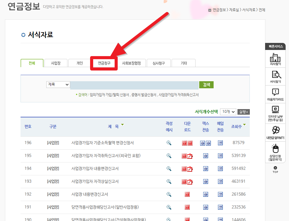 그러면 서식자료가 나오는데요. 여기서 화살표가 가리키는 "연금청구"를 누릅니다.