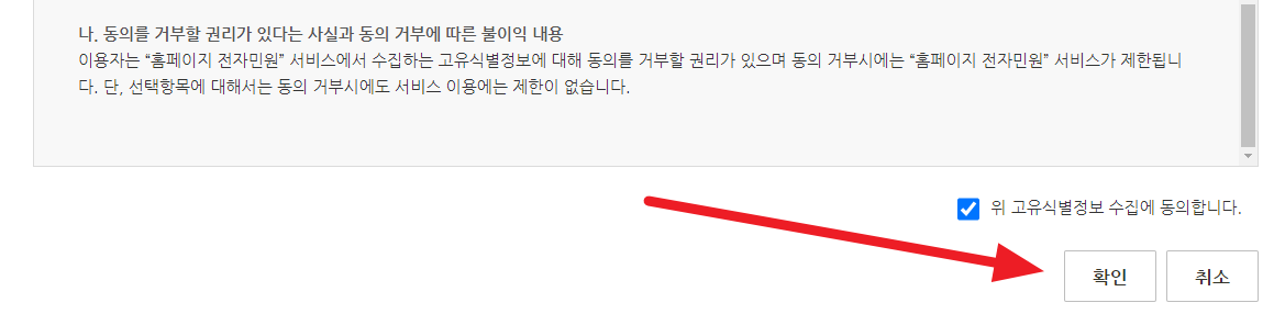 다음 화면에서 개인정보 수집 및 이용에 동의를 체크합니다.