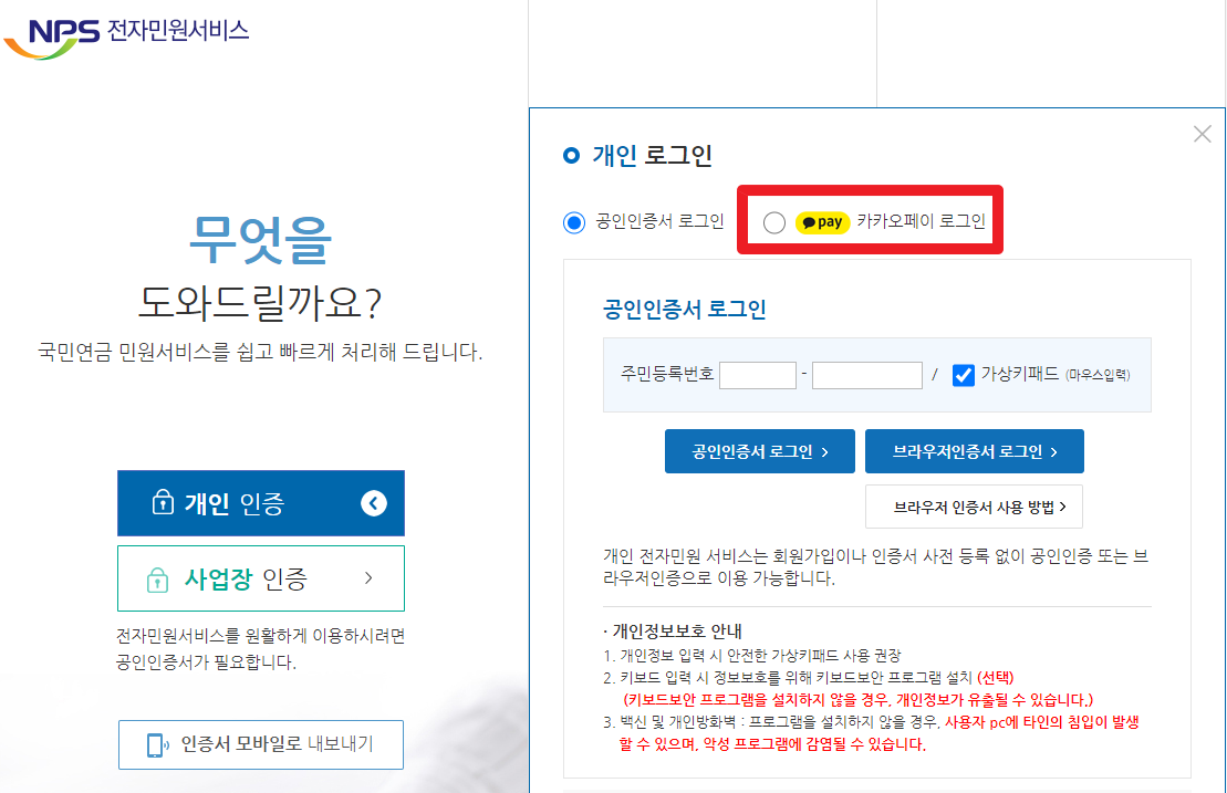 우선 아래에 링크해놓은 국민연금 전자민원 서비스로 들어갑니다. 그리고 카카오페이 로그인을 누릅니다.