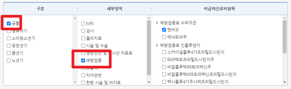 아래처럼 "공통"에 체크하고, "예방접종"에 체크 합니다.