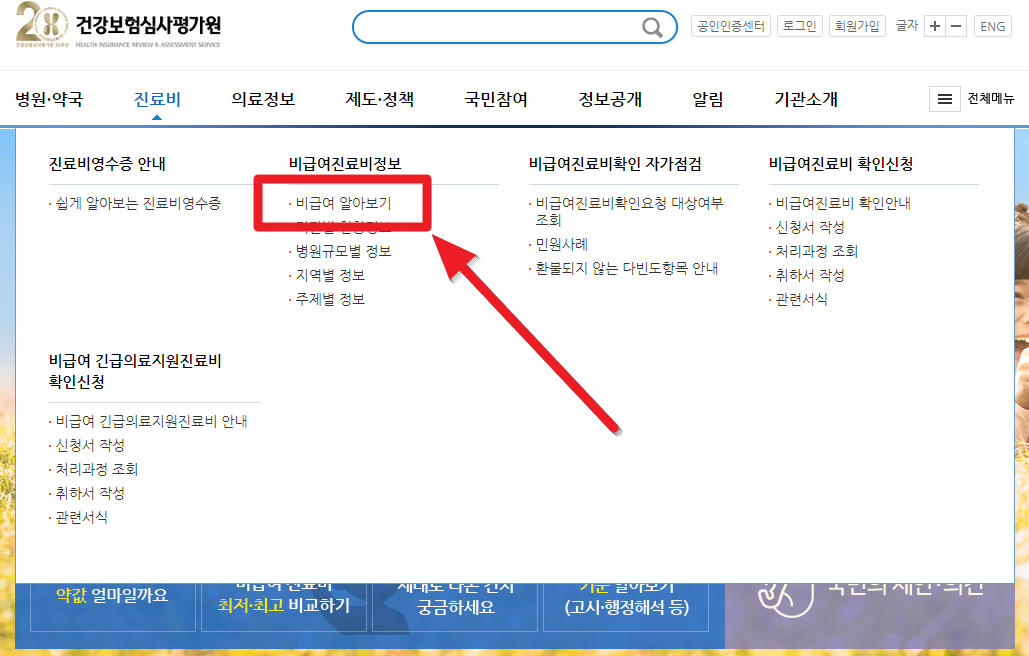 그리고 나오는 메뉴중에서 아래처럼 "비급여 알아보기"를 누릅니다.