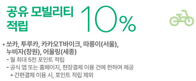 - 공유 모빌리티 이용 혜택: 서울따릉이, 세종 어울링, 창원 누비자, 쏘카, 트루카 등 공유 모빌리티를 이용할 때에도 금액의 10%를 에코머니로 적립, 최대 5천원까지 받을 수 있습니다.