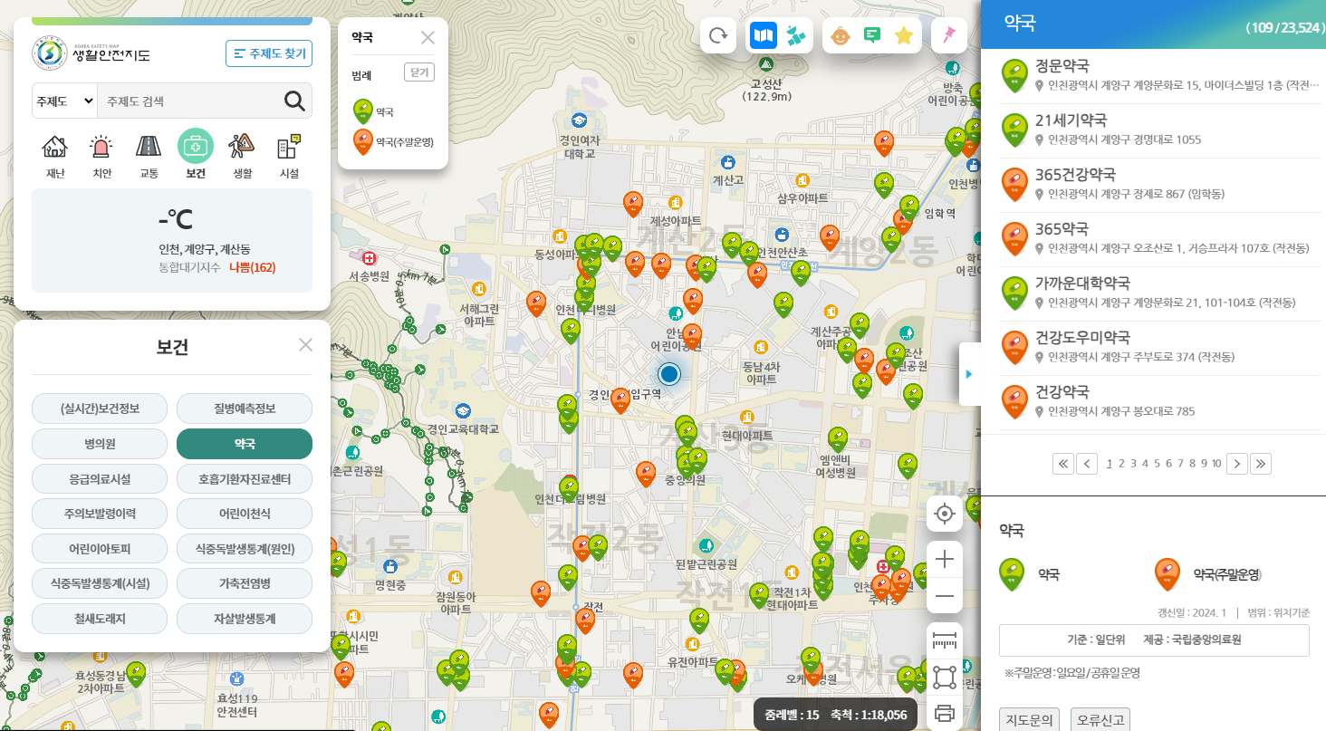 행정안전부에서 운영하는 생활안전정보 홈페이지(www.safemap.go.kr)에서도 주말 약국을 검색할 수 있습니다.