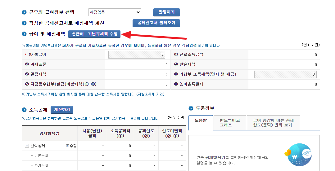 위와 같은 화면에서 '총급여·기납부세액 수정'을 누릅니다.