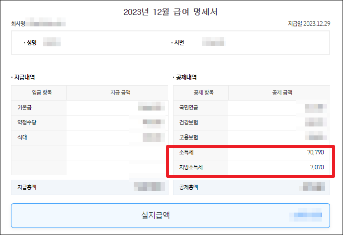 연말정산이라는 개념 자체가 매월 다르게 세금을 부과할 수 없으니 일정한 비율로 부과했다가 1년이 지난 후에 정산해서 환급해주거나 더 받아가는 것이다보니 아래처럼 원천징수세액이 얼마인지 정확히 알아야 합니다. 이는 회사에서 일괄적으로 했기 때문에 이 역시 급여명세서를 보고 확인하면 알 수 있습니다.