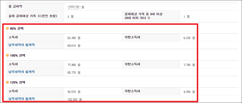 본인의 급여명세서를 확인해서 소득세와 지방소득세가 얼마인지 보면 원천징수율이 80%인지 100%인지 120%인지 알 수 있는데요. 위 대상자의 경우에는 소득세가 70790원이므로 100%에 해당함을 알 수 있습니다. 금액이 조금 차이나는 이유는 비과세인 식대를 빼지 않았기 때문입니다.