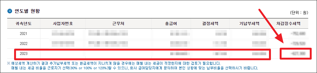 이렇게 STEP 02로 넘어가면 아래처럼 연도별 현황이 보이면서 2023년도 차감징수세액이 보이게 됩니다. 금액에 마이너스(-)가 붙어있으면 환급을 받게 되는 것입니다.