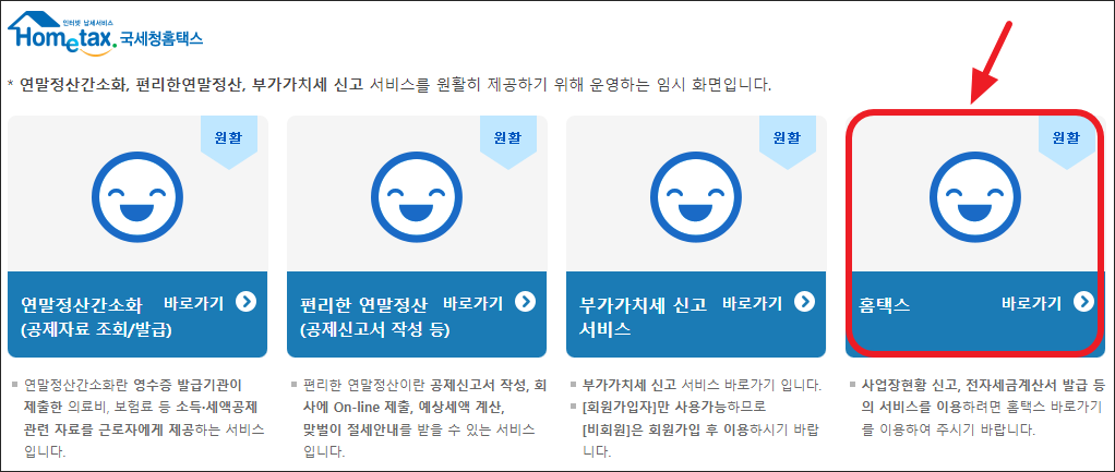 평상시에 접속할 때랑 연말정산이나 부가가치세 기간에 접속할 때랑 화면이 조금 다른데요. 홈택스 화면에 접속합니다.