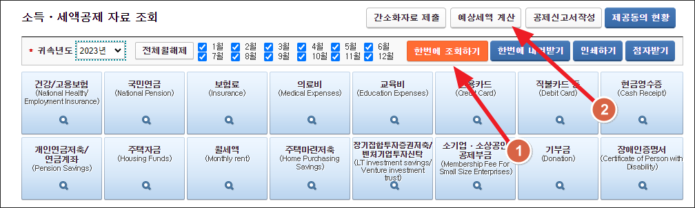 이제 연말정산 간소화 페이지로 접속해서 위 그림처럼 '한번에 조회하기'를 누른 후에 '예상세액 계산'을 누릅니다.
