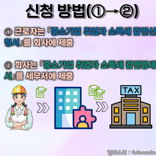 신청방법은 우선 근로자가 '중소기업 취업자 소득세 감면 신청서'를 회사에 제출하고, 회사는 '중소기업 취업자 소득세 감면 명세서'를 세무서에 제출하면 됩니다.