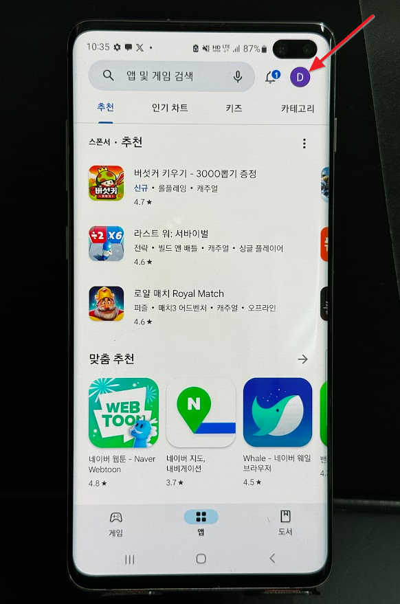 'Play 스토어'가 실행되면, 우측 상단에 있는 프로필을 누릅니다.