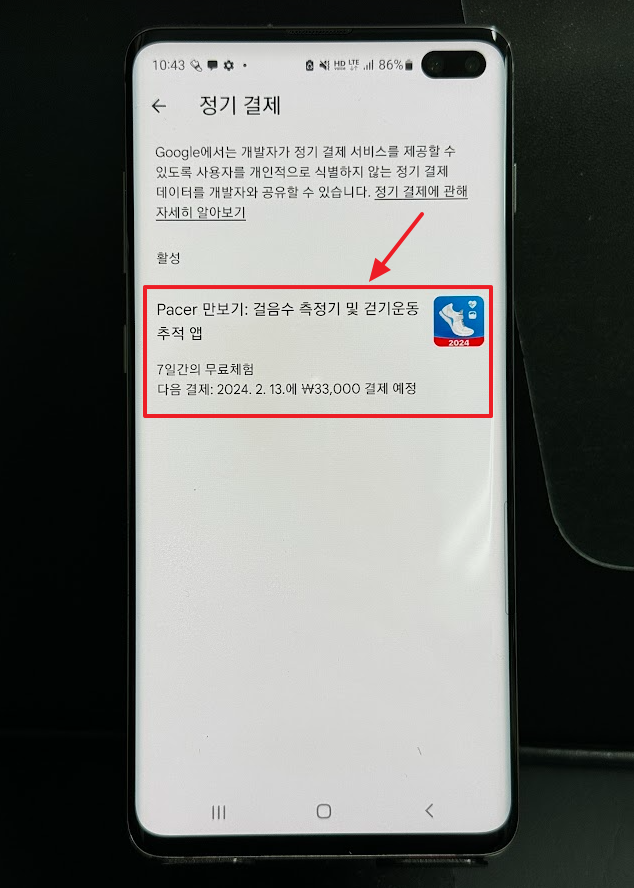 정기결제 내역에 아무것도 없으면 현재 '정기결제'중인 앱이 없는 것입니다. 하지만 아래처럼 내역이 나오면 정기결제 중인 앱이 있는것인데요. 저는 Pacer 만보기가 현재 정기결제 되어있는 상태입니다. 해당 앱을 누릅니다.