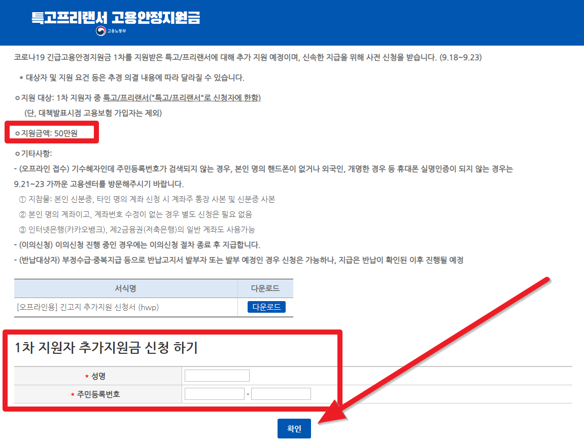 다음과 같은 화면이 나오면, 1차 지원자 추가지원금 신청하기에 성명과 주민등록번호를 입력하고 아래 "확인"을 누릅니다.
