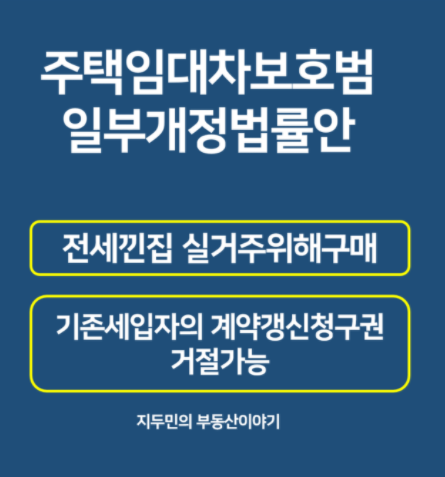 임대차3법의 계약갱신청구권때문에 전세낀 집을 그 계약기간이 만료되는날 맞춰서 실거주하려고 사는 것이 불가능하다는 지적에 대해서, 실거주를 목적으로 집을 살경우에는 기존 세입자의 계약갱신청구권을 거부할 수 있도록 한 법안이 발의되었습니다.