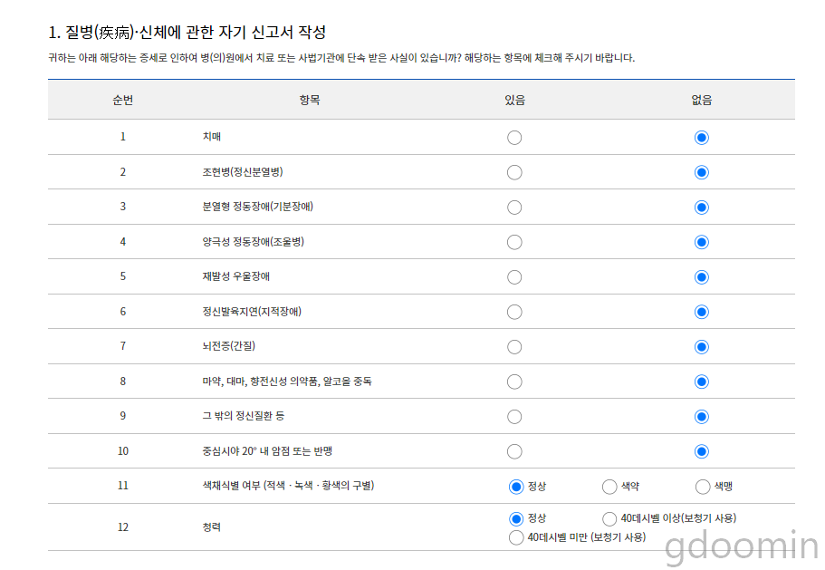 질병 신체에 관한 자기 신고서를 작성합니다.