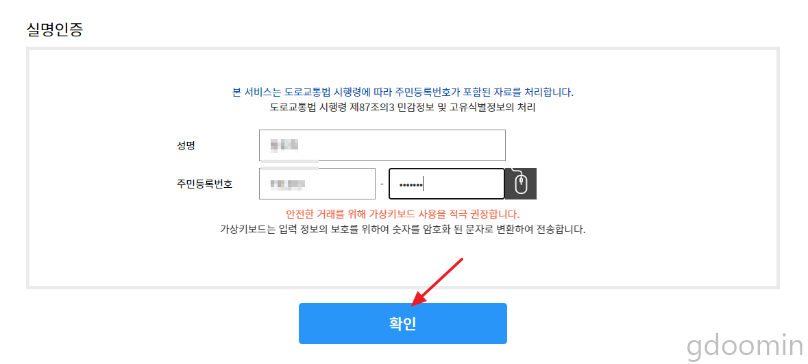 성명과 주민등록번호를 입력하고 확인을 누릅니다.