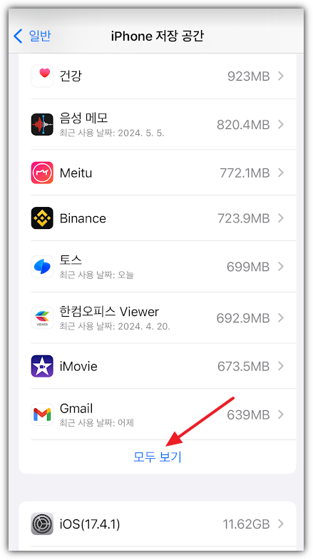 iPhone 저장공간 화면에서 '모두보기'로 들어갑니다.