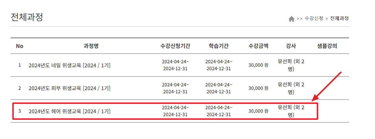 처음으로 미용위생교육을 진행하는 분이라면 회원가입부터 수강신청, 결제까지 차근차근 진행하세요. 각자의 분야에 맞는 교육을 선택해 수료하시길 바랍니다.