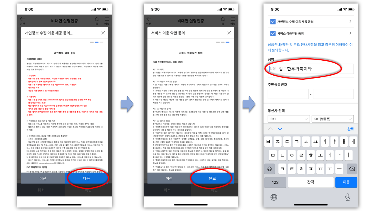 연달아 나오는 개인정보 수집 이용 제공 역시 "다음", 서비스 이용 약관 동의 도 읽어보시고 "완료"를 누릅니다.
