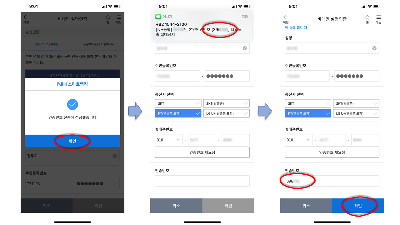 그러면 인증번호 전송에 성공했다고 나오고 곧 문자로 인증번호가 옵니다. 6자리 번호가 오는데 입으로 한번 되뇌이고 입력하고 "확인"을 누릅니다.