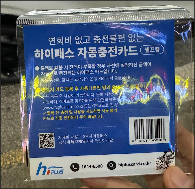 하이패스 없이 무정차로 통과해도 통행료를 납부할 수 있는 '스마트톨링'서비스가 2024년 5월28일부터 시범운영되기 시작했습니다. 구간은 경부선과 남해선 서영암등 일부인데요. 아무래도 아직은 하이패스가 필요할 것 같아서 하이패스 단말기를 당근으로 구매하고나서 하이패스 카드를 고민하다가 연회비도 없고 번거롭게 충전을 할필요도 없는 '자동충전카드'를 구매했습니다. GS25 편의점에서 5000원 정가로 구매할 수 있으며 네이버 페이로 구매하면 몇십원이라도 저렴하게 구매할 수 있습니다. 물론 하이플러스카드 홈페이지에서 무료배송 이벤트를 진행할 때는 배송비 없이 5000원에 구매할 수도 있습니다. 단, 셀프형 자동충전카드는 등록 시점으로부터 24시간 이후 사용이 가능하니, 급하신 경우 그냥 하이패스 차로로 통과 후 주소지로 오는 고지서로 납부하시기 바랍니다.