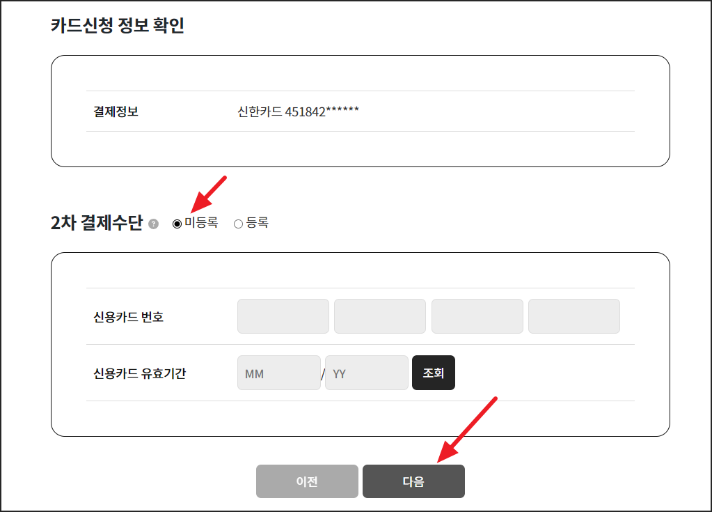 혹시 결제가 안될 것을 대비해서 '신용카드'로만 2차 결제수단을 입력할 수 있는데요. 이는 선택사항입니다. 이미 신용카드로 결제수단을 했기 때문에 여기서는 '미등록'으로 하고 '다음'을 누릅니다.