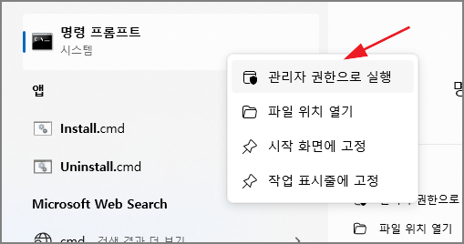 - Windows 검색창 → “cmd” 입력 → “관리자 권한으로 실행” 선택