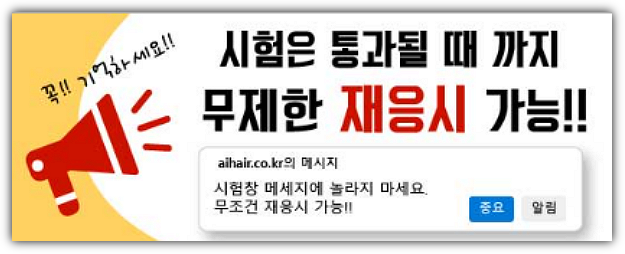 시험은 통과될 때 까지 무제한 재응시 가능하니 시험장 메세지에 놀라지 마시고 무조건 재응시 하세요.