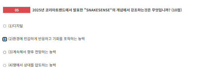 👉 2025 코리아트랜드에서 발표한 “SNAKESENSE” 의 개념에서 강조하는 것은 무엇입니까? (10점)
