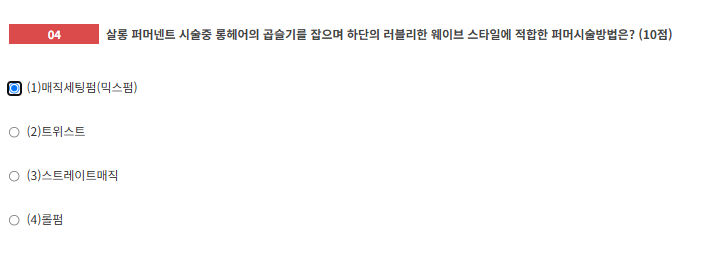 👉 살롱 퍼머넨트 시술중 롱헤어의 곱슬기를 잡으며 하단의 러블리한 웨이브 스타일에 적합한 퍼머시술방법은? (10점)
