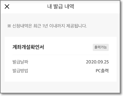 이제 확인을 하는데요, "계좌개설확인서/1매"를 PC출력으로 발급하는 것을 확인합니다. "신청하기"를 누릅니다.
