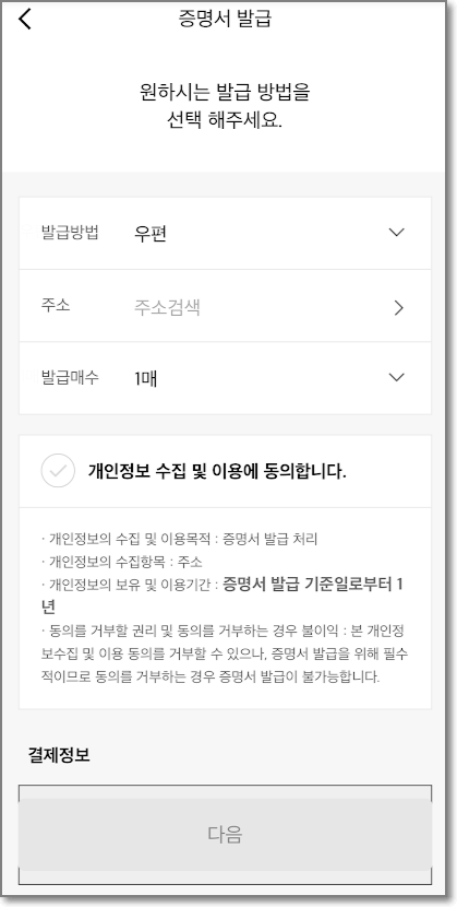 여기서 "우편"으로 하면 우편수수료 3000원이 부과가 되는데요. 우편으로 받으시길 원하시면 주소입력하고 수수료3000원 결제하시면 됩니다. 여기서는 PC출력을 해보겠습니다.