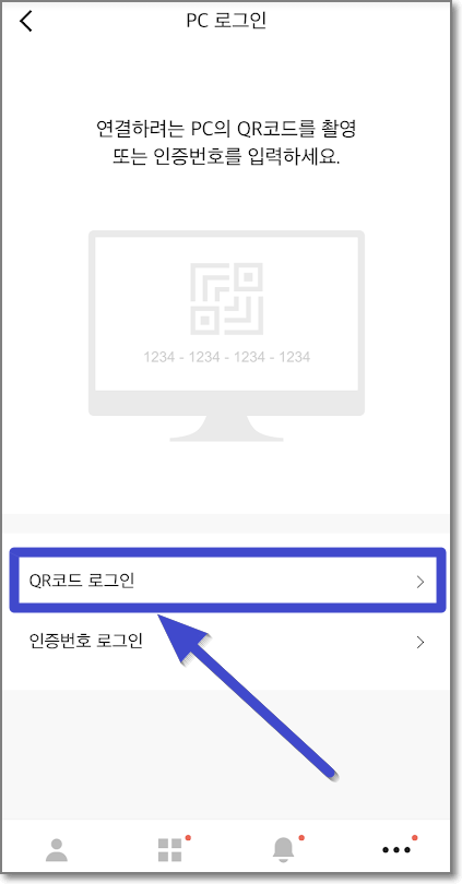 연결하려는 PC의 QR코드를 촬영 또는 인증번호를 입력하라고 나오는데요. 여기서 조금 잘못써놓은것이 "촬영"아니고 "비추는 것"입니다. 뭔지 보시면 금방 아실텐데요. "QR코드 로그인"을 누릅니다.