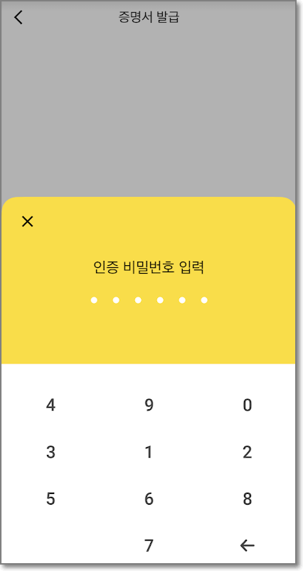 혹시나 폰을 주운사람이 열려있던 카카오뱅크 앱에서 증명서를 발급할 수도 있으니까 다시한번 비밀번호를 입력하라고 요구합니다. 여기서 인증비밀번호를 입력합니다.
