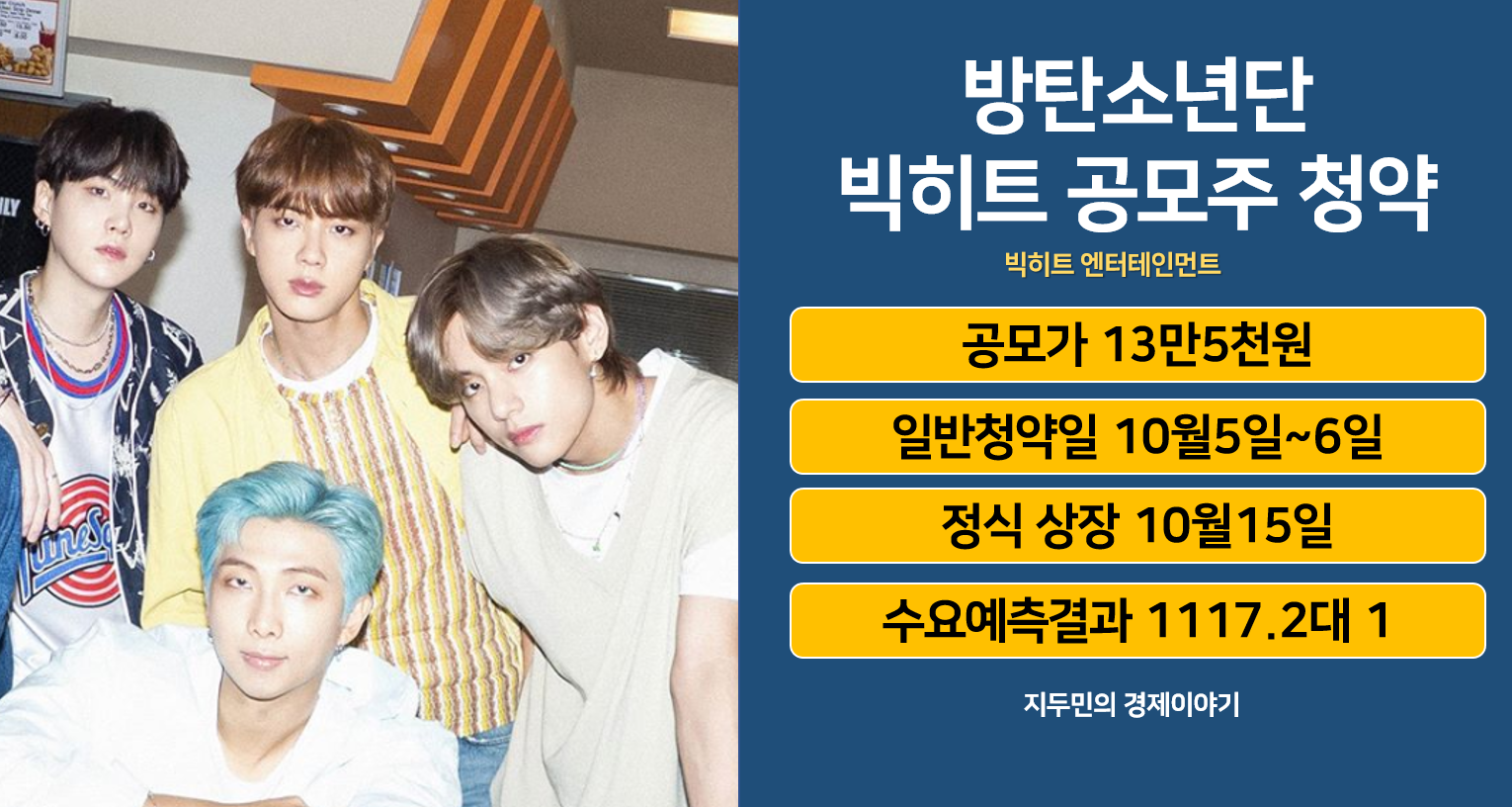 카카오게임즈를 통해서 공모주청약이 많이 알려진가운데 금년도 최고의 인기몰이가 예상되는 빅히트 엔터테인먼트가 28일 공모가 13만5천원으로 확정되면서 10월5일과 6일 양일간 일반청약에 나서게 됩니다.