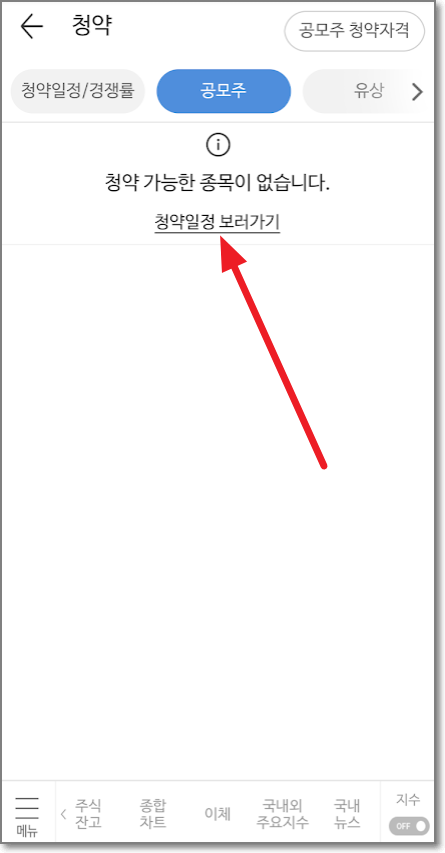 현재는 청약 가능한 종목이 없다고 나올텐데요. 여기서 "청역일정 보러가기"를 누릅니다.