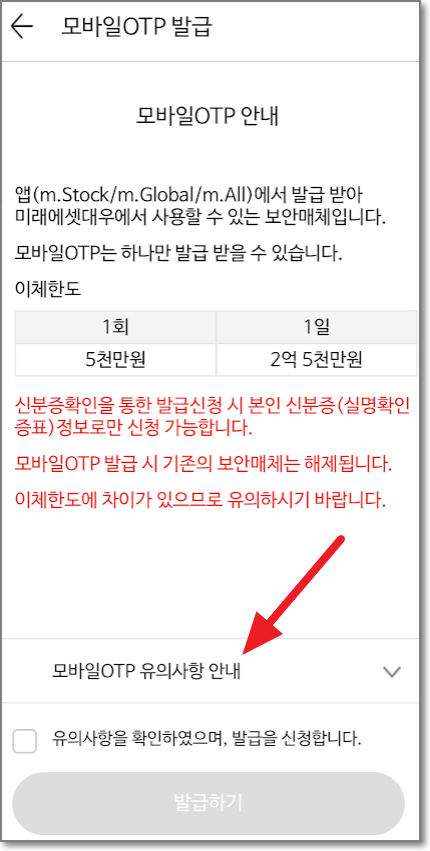 계좌 개설 이후에 m.Stock (이 앱이랑 다른 앱입니다), 또는 m.ALL(이 앱입니다.)의 모바일 OTP 발급 화면에서 모바일 OTP를 발급받으라고 합니다. "확인"을 누릅니다.