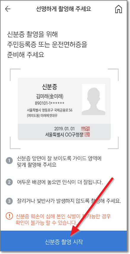 신분증 촬영을 위해서 카메라가 뜨는데요. 카메라가 접근한다고 하면 확인을 누르시고 신분증이 칸에 꽉 차게 비추면 알아서 촬영됩니다. (촬영 버튼 누를 필요 없습니다.)