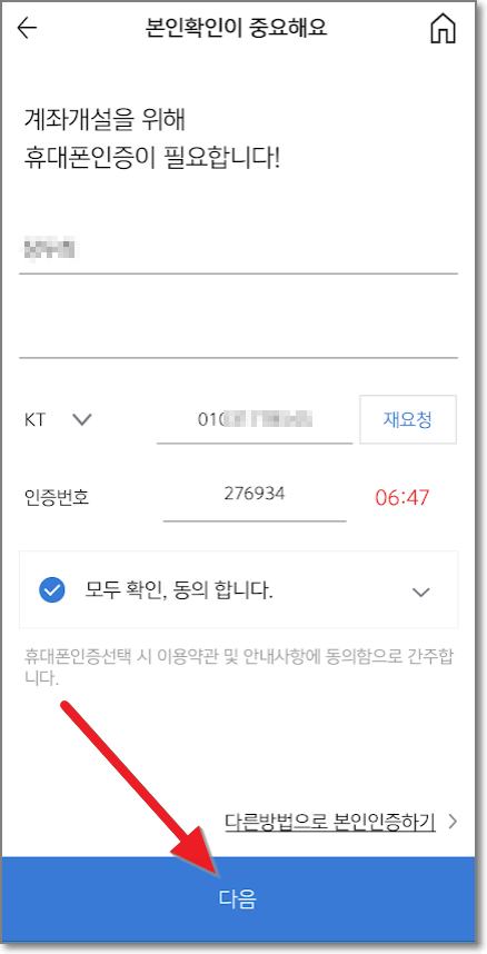 문자로 온 인증번호를 인증번호란에 입력하고 "다음"을 누릅니다.