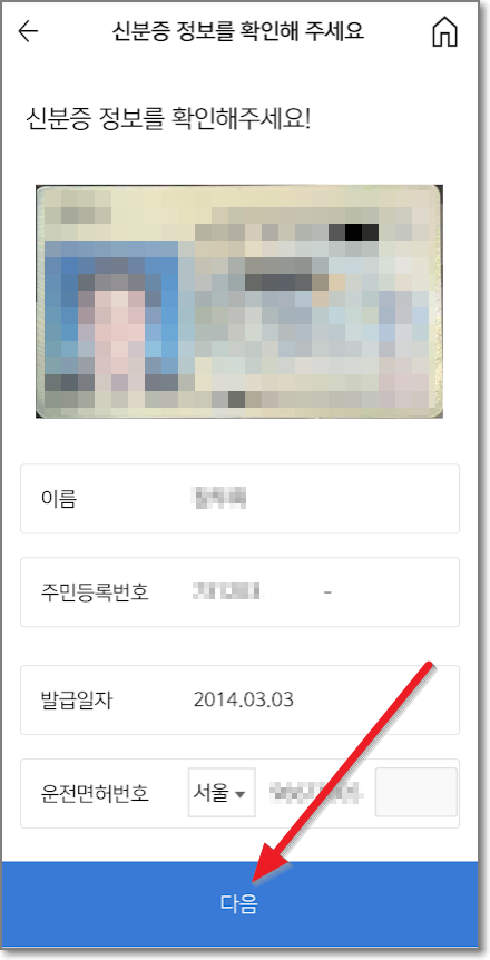 찍고 나면 카메라가 인식하지 못한 부분을 입력하라고 합니다. 필요한 사항을 입력하고 "다음"을 누릅니다.